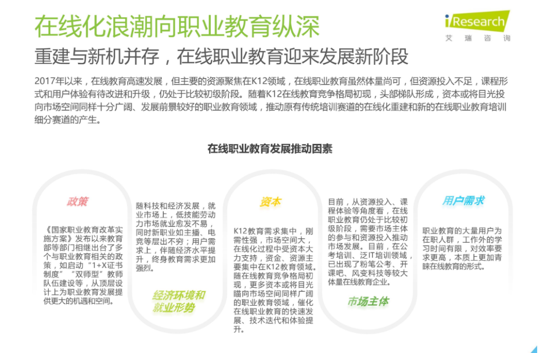 自2017年3月首次出现在政府工作报告中,之后在线教育,在以往政策红利的基础上更成为政策鼓励的热门区域,发展前景被市场广泛看好。但随着国家双减政策的落地,K12教育板块受挫,更多的资本将目光瞄向市场空间,同样广阔的成人在线教育。