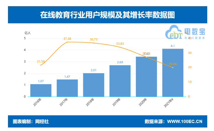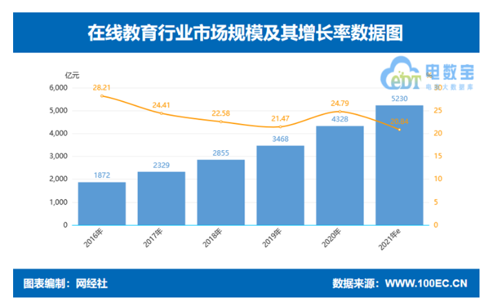 据网经社发布的《2021年(上)中国在线教育市场数据报告》数据显示,2020年中国在线教育市场规模达4328亿元,同比2019年的3468亿元增加24.8%。据中科院发布数据,2020年我国在线教育市场规模为3807亿元,同比上升21.5%。随着市场规模的进一步扩大,越来越多的人瞄准了在线教育的市场。同时,我国国家政策对于互联网+教育也是十分支持,这样全新的教育方式正在惠及更多互联网用户。