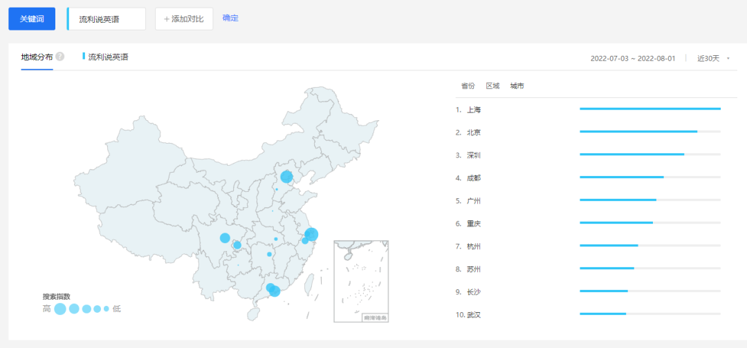 2)英语流利说的使用人群主要分布在广东、上海、北京、 江苏、山东、四川等省份和一二线城市,这些都是经济较发达的地区,人们的收入水平都比较高,会比较注重教育质量的提升和个人能力素质的提升,知识付费的意识也相对比较强些。