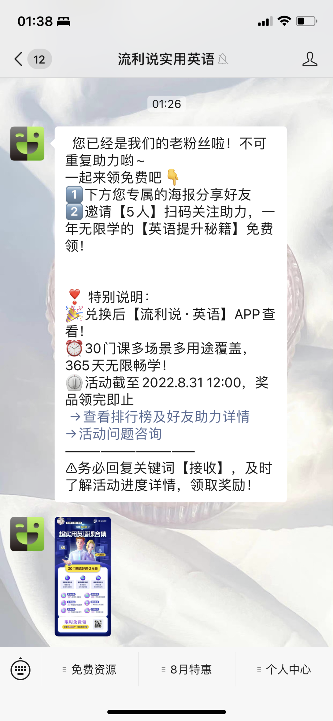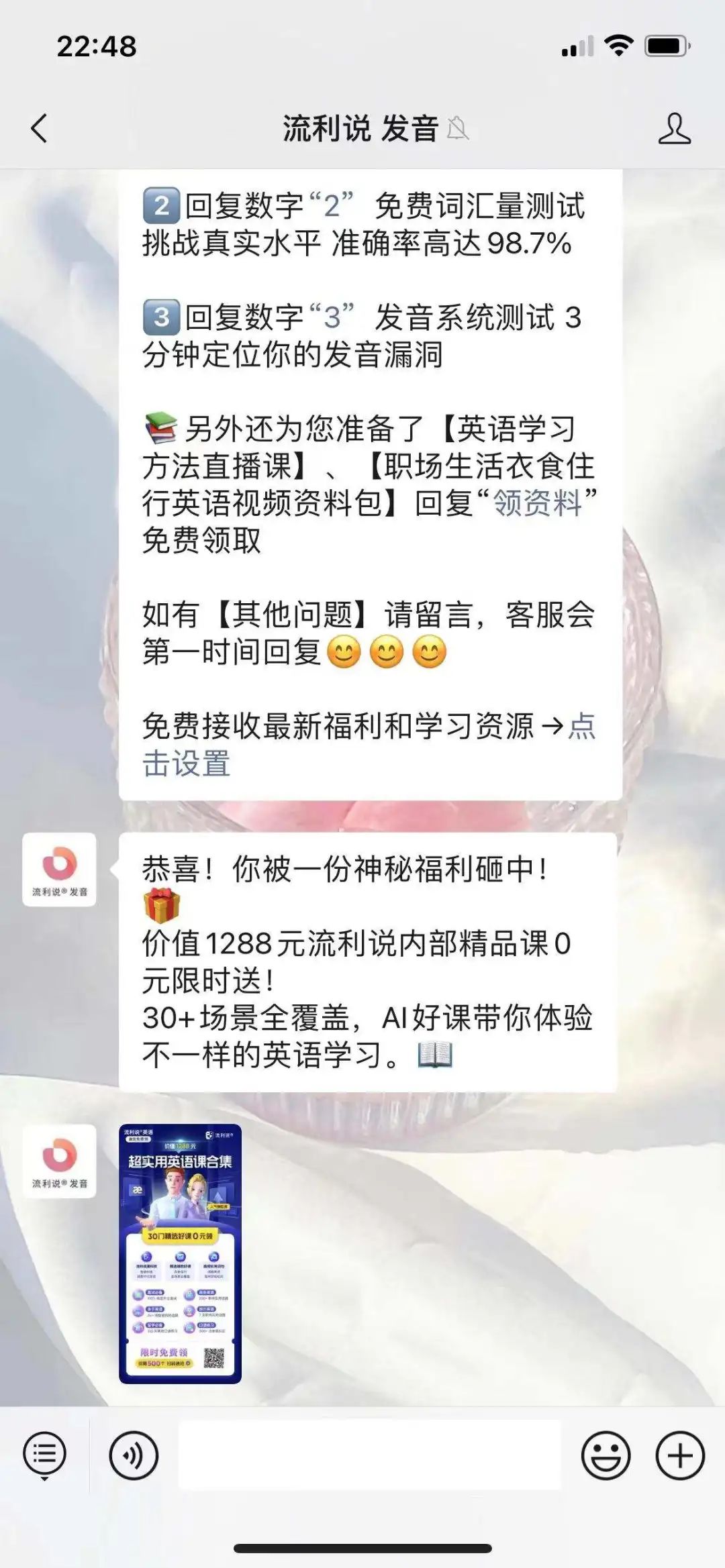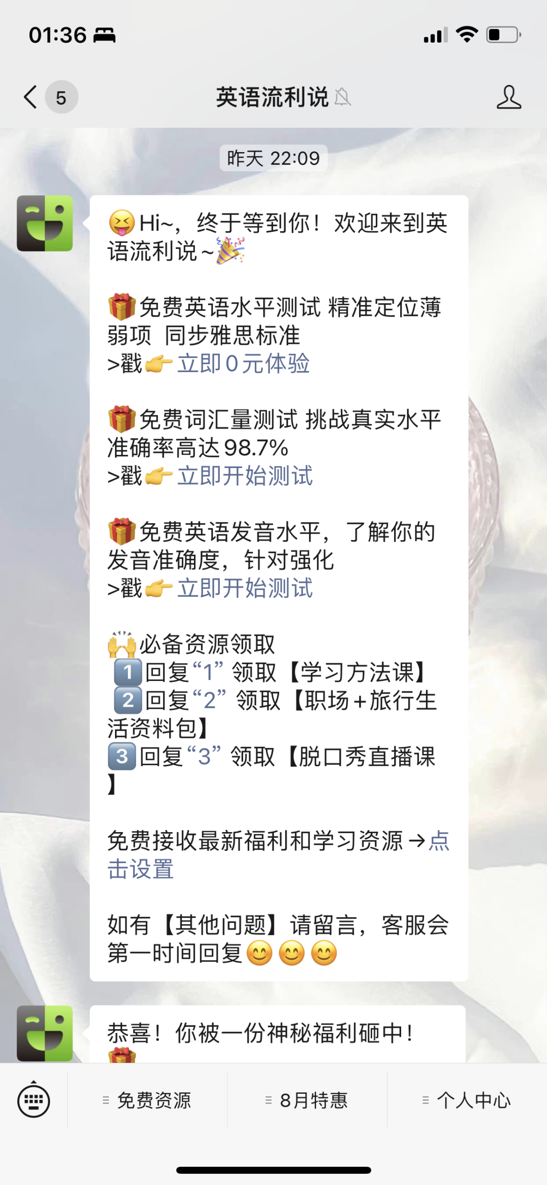 关注公众号,自动回复引导测试和领资料;同时引导可以0元学习实用英语课程