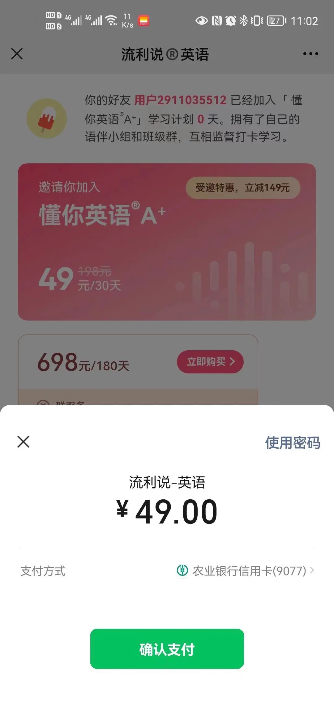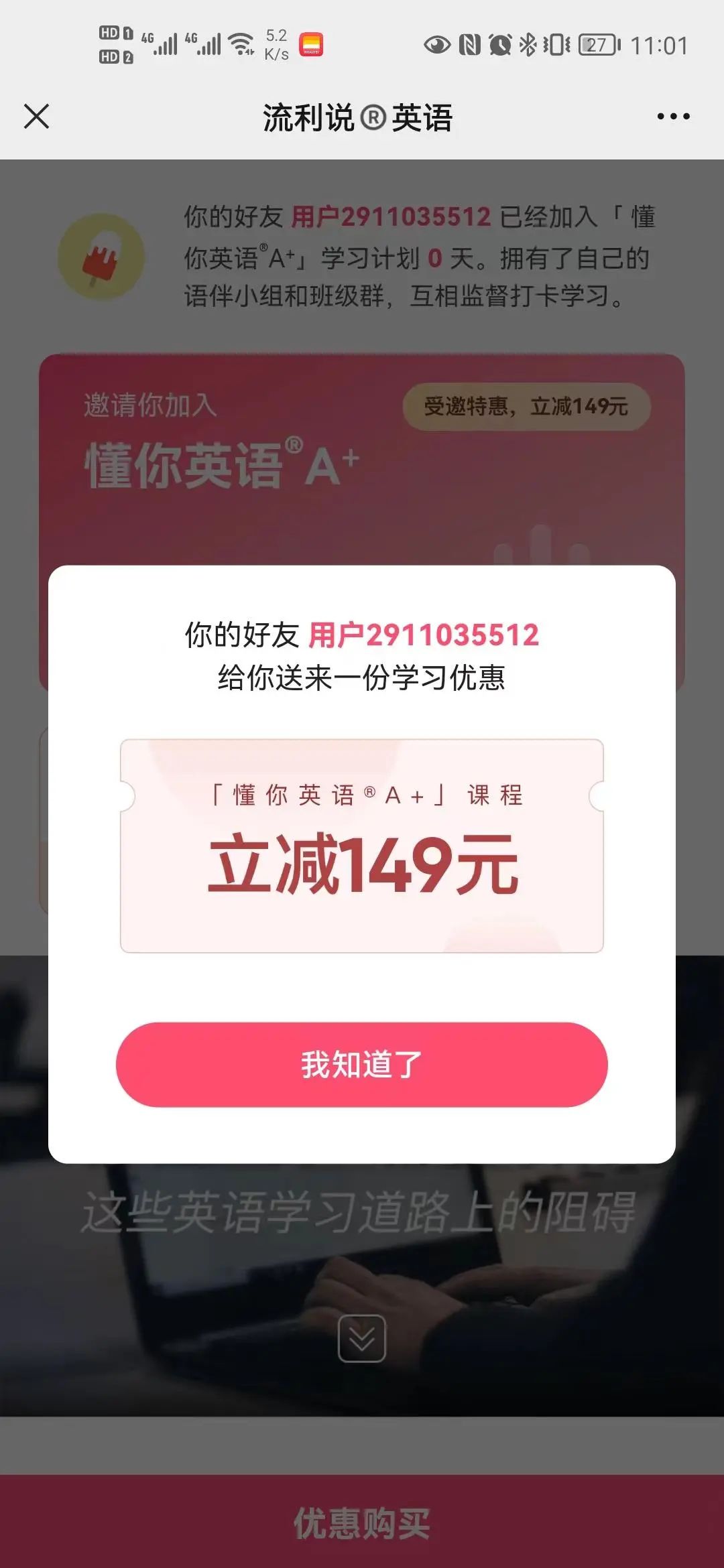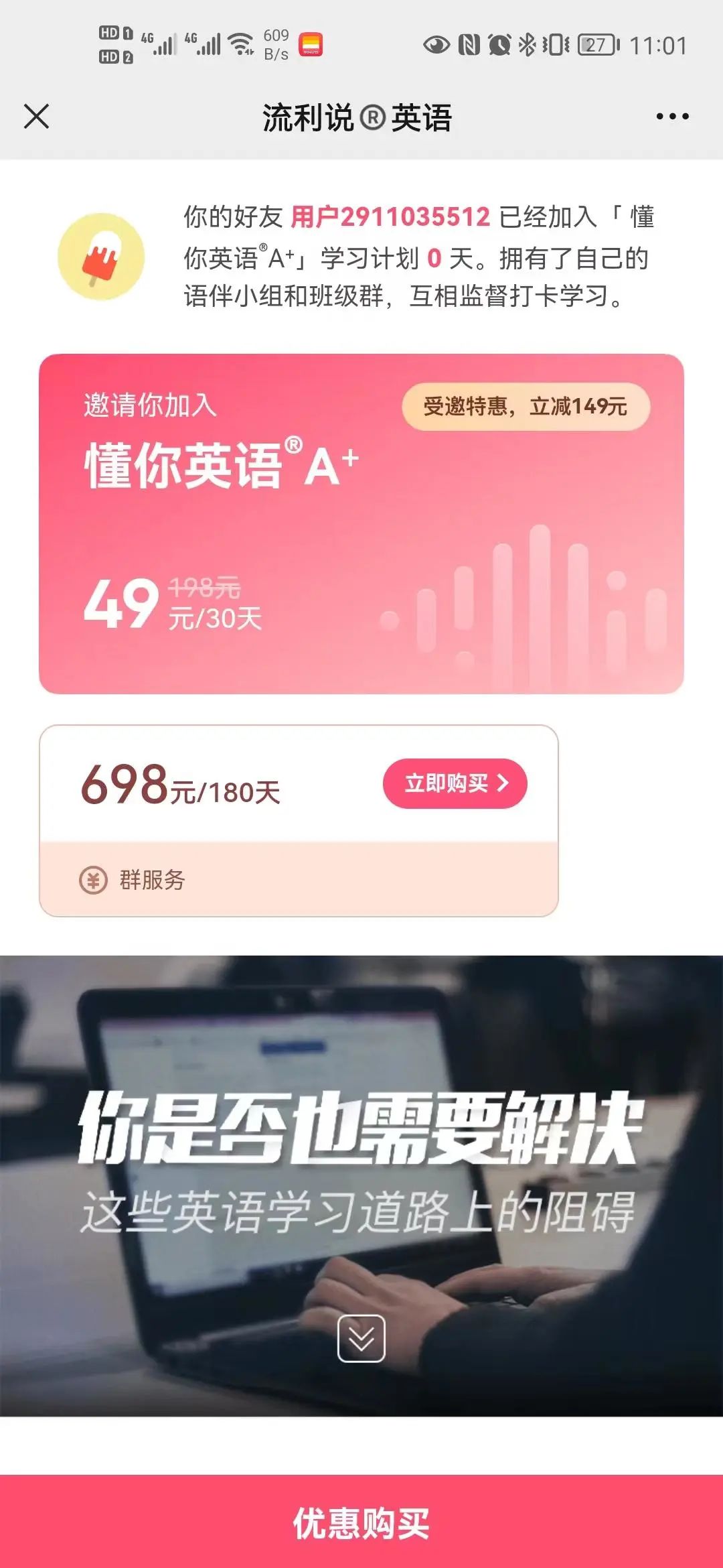 拼团活动严格意义上来说,我觉得更像是转化,因为流利说并没有真正的让用户去邀请好友参加拼团,而是自动帮用户拼团成功,只不过会在拼团价格的旁边放上个人购买价,从而让用户感受到优惠,促使用户下单。