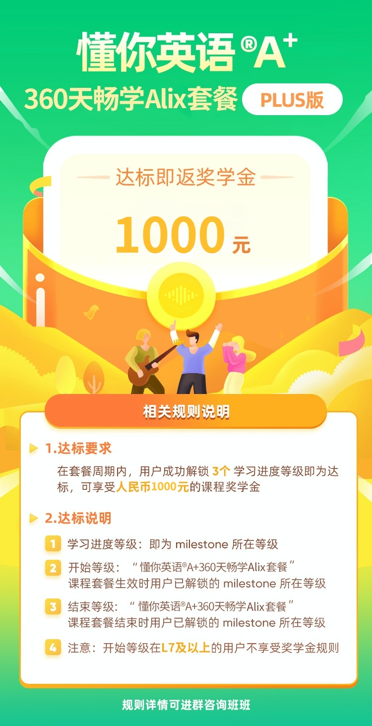 2、赠送一年的Alix外教口语课 3、360天内学习完3个level的课程可返现1000元现金学费 |