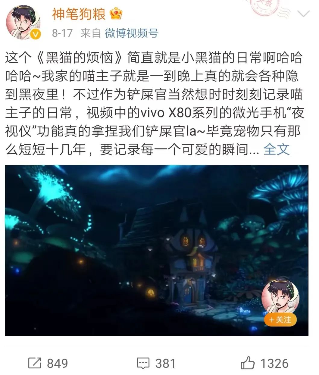 前后鲜明的对比,让vivo X80的“夜视仪”功能非常精准、形象地传达给了用户。vivo X80照亮了黑猫爷爷的爱情,这种基于故事性、画面感的功能植入,也可以强化用户的记忆点。