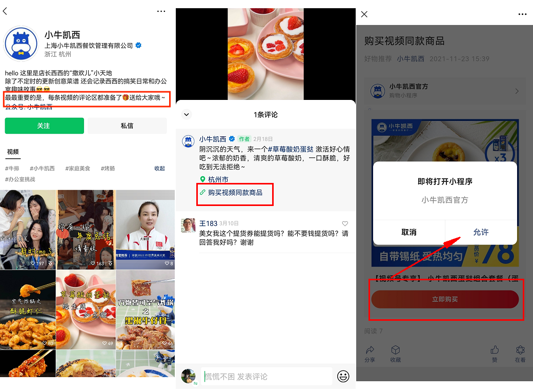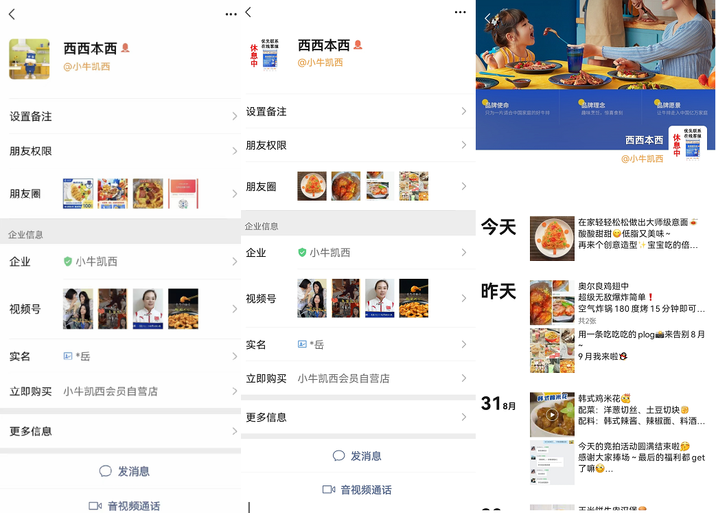 小牛凯西视频号内容以美食攻略、直播间片段、情景式产品种草以及活动推广为主。