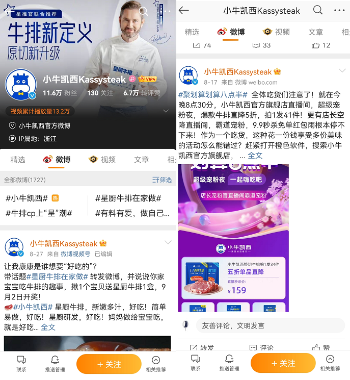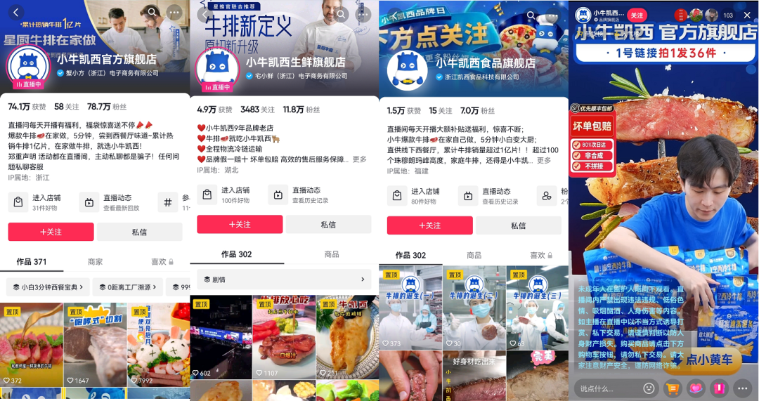 小牛凯西在抖音上,有3个主账号,总粉丝数超过100w万,视频内容以产品种草、美食攻略、减肥食谱等为主。另外,还会每日安排直播,主要销售西冷牛排。
