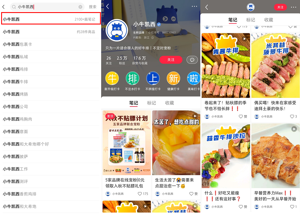 小牛凯西在小红书中相关的笔记有2100+篇,官方账号粉丝2.5万,笔记以视频形式展现,内容以产品种草、美食攻略、品牌活动为主。