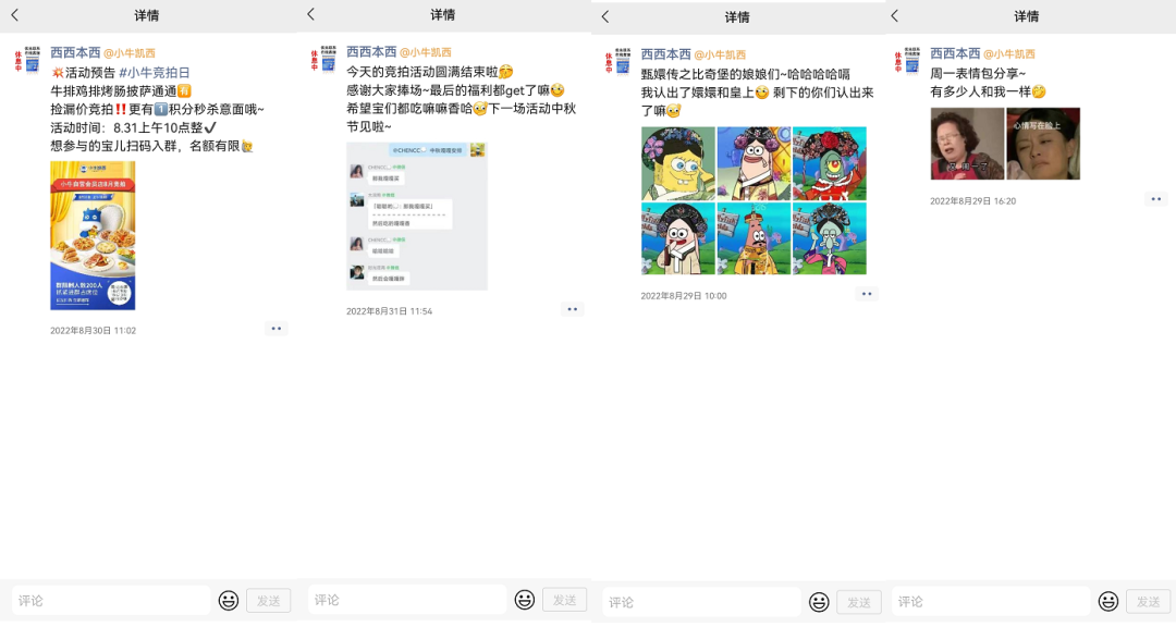 值得一提的是,员工朋友圈的内容较为多样化,以生活日常、产品安利、社群活动、产品活动为主。文案多用生活化风格表示,更能展现真实的IP形象,而不是一个冷冰冰的客服。
