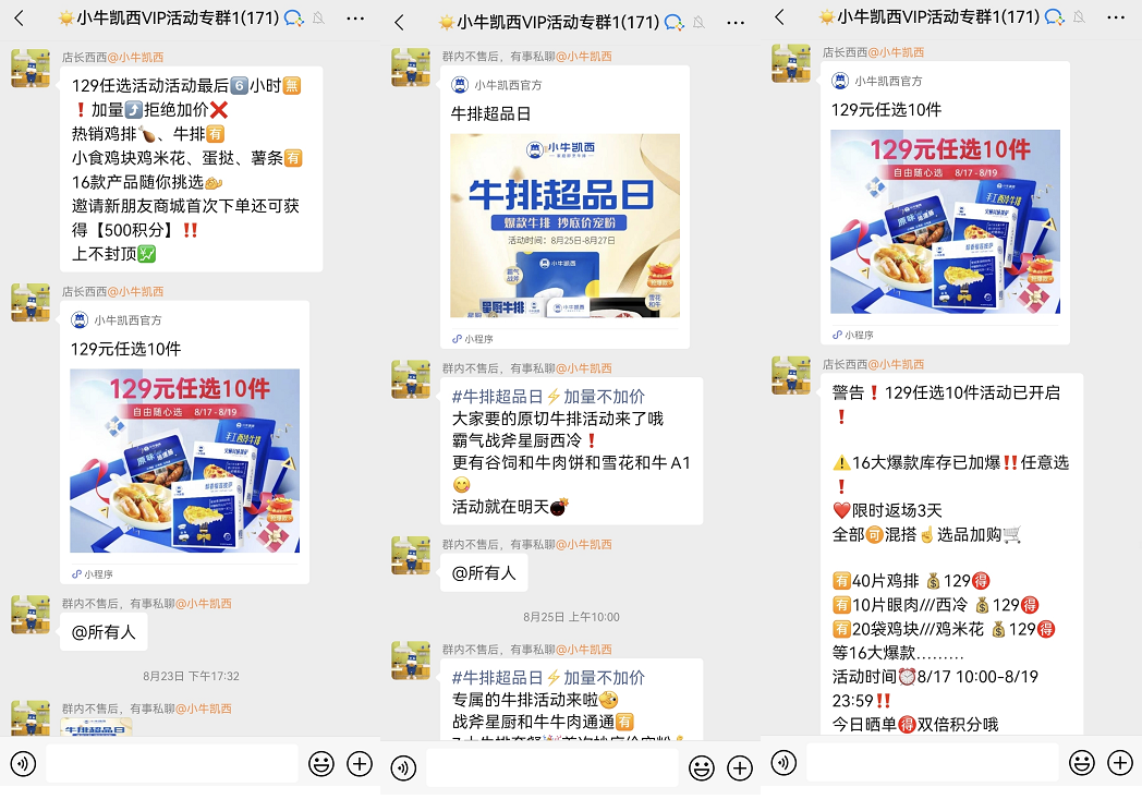 因为是活动专群,所以群内都是各式各样的活动,例如129任选10件、牛排超品日、拼团等,而且仅提供售前服务。