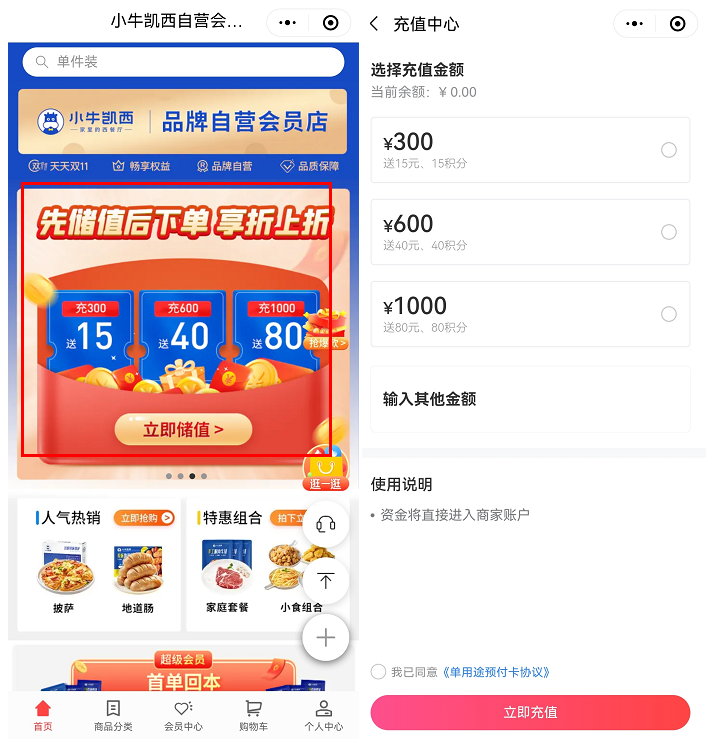 2)引导用户储值,提前锁客:新用户办理1年付费会员只需28元,权益丰富,每卡赠送 66 元会员礼包,让客户“首单即回本”。且成功开卡后,会自动跳转用户储值,提升储值率,提前锁客。