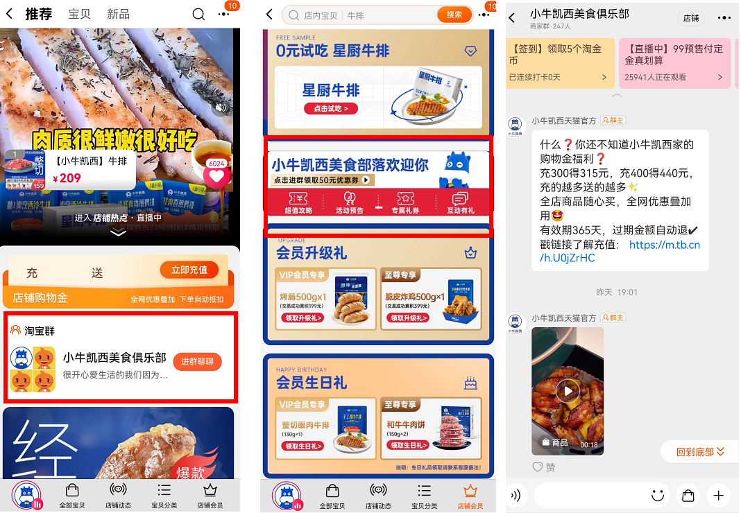不同的是,小牛凯西建立了淘宝粉丝群,分别在首页和会员权益中引导用户进群,聚集目标用户,利于更快捷地触达。群内容以推广购物金、产品种草、店铺活动为主。