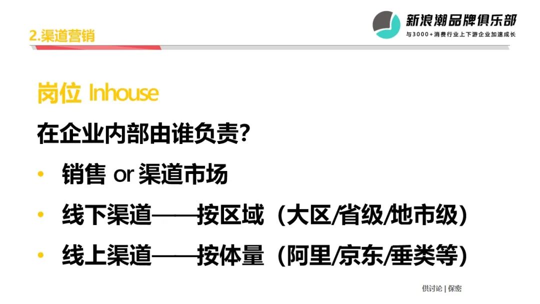 内部岗位会分销售或者渠道市场。线下渠道按区域分为大区、省级、地级市,一层层代理商往前走,然后去算某一个渠道要卖掉多少、铺多少货、价位怎么给、让多少利等等。线上渠道按体量分为阿里、京东、垂直类等。