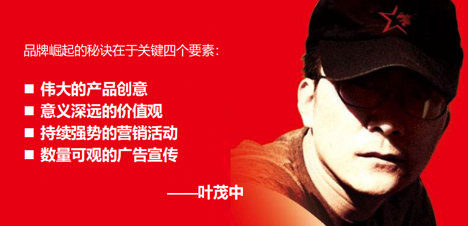 “品牌崛起的秘诀在于关键四个要素:伟大的产品创意,意义深远的价值观,持续强势的营销活动,数量可观的广告宣传。”