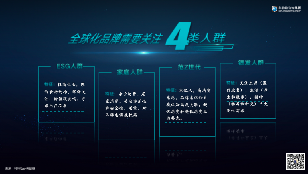在这里我列出来全球性的四类人群,每个国家有差异,但是在今天的主流国家主流市场当中,这四类人群是我们任何一个想做成全球品牌不能够忽视的。