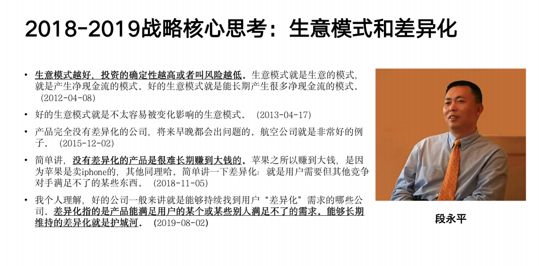 段永平讲生意模式和差异化,生意模式越好,投资的确定性就越高,风险就越低。