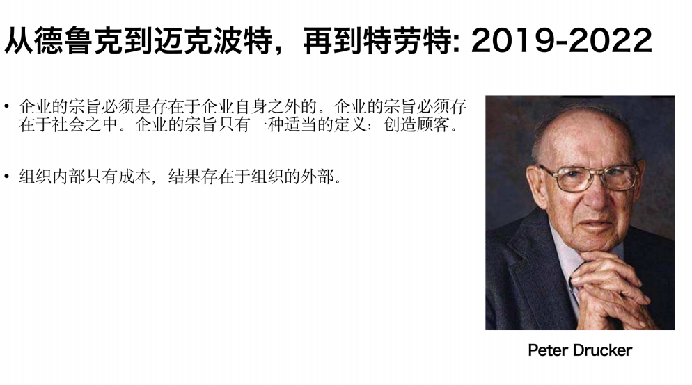 但是从最早的德鲁克到迈克波特再到特劳特,大家越来越强调竞争,以及竞争的定位和差异化,因为这个世界变成了供过于求,你必须解释我为顾客创造了什么样的差异化价值。