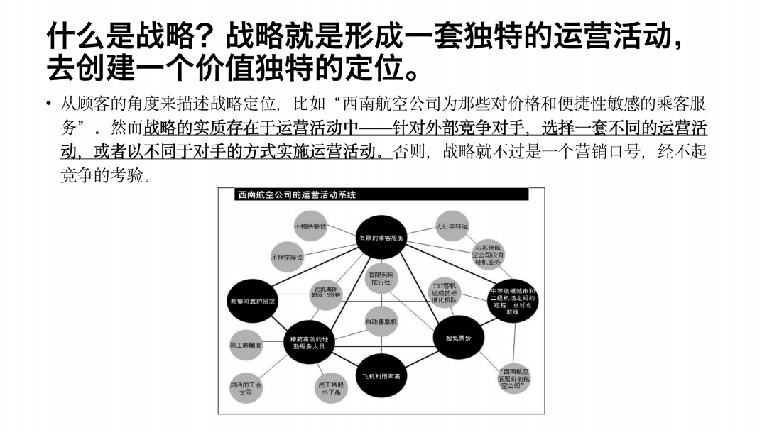 当年我读波特的理论,他本质上就是在讲战略是一种差异化,你要在外面找到最大的机会建立这种差异化,并且在内部形成独特的运营活动。