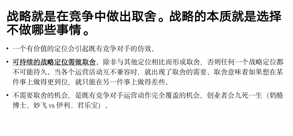 所以迈克波特讲战略就是要看外面最大的机会是什么,然后围绕这个机会形成一套独特的运营活动,这里面就意味你需要做出取舍。