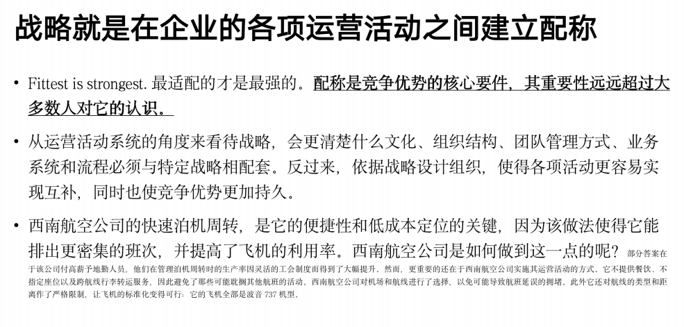 而美国航空等其它航空公司也在抄西南航空,它们专门做了类似的产品线,但最后都失败了,就是因为他们的运营活动不是为特定的目标而设计的。