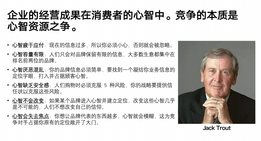 我对于这个事情的进一步理解是来自于定位理论的提出者特劳特,他认为企业的经营成果体现在消费者的心智中,竞争的本质是心智资源之争。