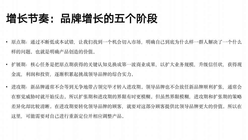 沿着这个路径去思考问题,我认为品牌增长一般会经历五个阶段。