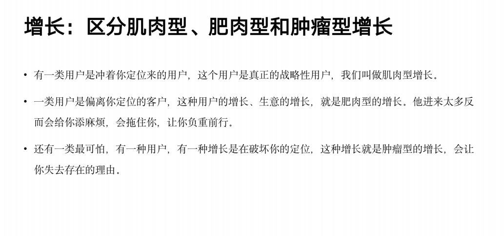而有一类用户是偏离你定位的,比如你明白自己做的是去屑洗发水,结果你说我这个产品可以柔顺头发,这种用户没有朝着你的定位来,买了你的产品对你的评价也不会好,这种增长可能就属于肥肉型增长,