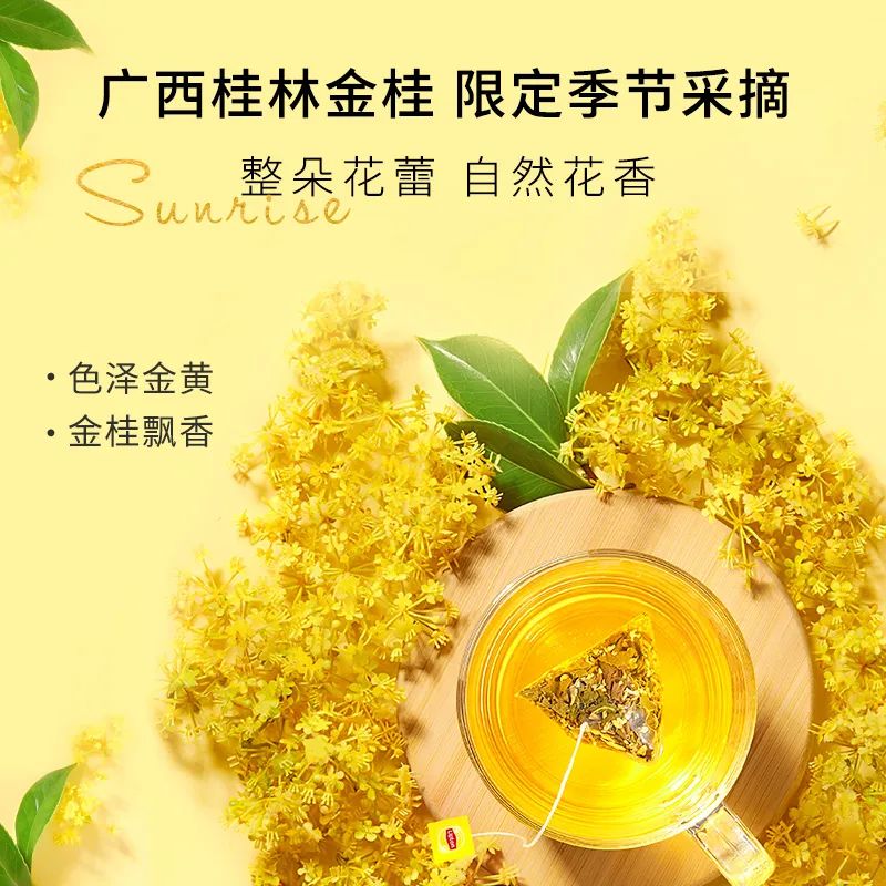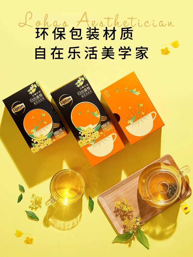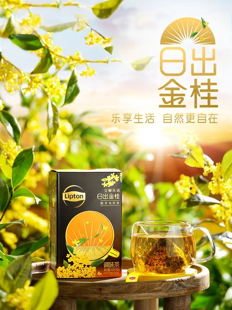 除了设计方面,口味年轻化也是立顿年轻化的发力点。比如,立顿瞄准目前深受年轻消费群体喜欢的乌龙茶口味进行创新,推出桂花乌龙「日出金桂」,其一系列沉浸式桂花场景海报,塑造“桂花飘香秋意浓”的品茶场景,让人瞬间回归大自然,引导年轻用户享受片刻慢生活。