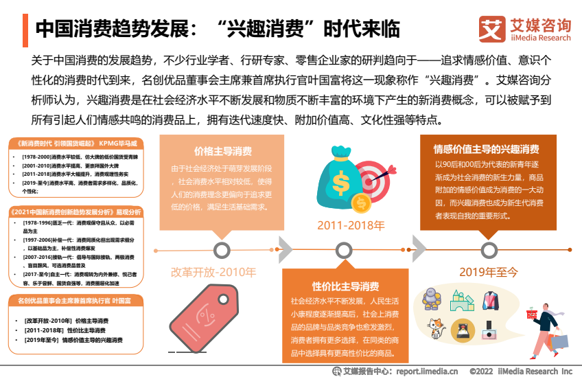 2020年,名创优品集团董事会主席兼CEO叶国富首次提出了“兴趣消费”理论。在他看来,被兴趣支配是这届年轻人最大的消费特征,单纯注重消费价格和功能的时代已经过去了,年轻人开始愿意为情感价值买单。“兴趣消费”的时代来了。