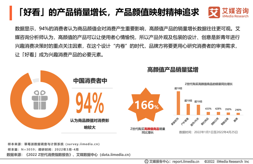 根据《兴趣消费白皮书》的调研数据,94%的消费者认为商品颜值会对消费决策产生重要影响,而高颜值产品的销量增长数据往往更可观——数据显示,Z世代购买高颜值商品销量同比增长166%。