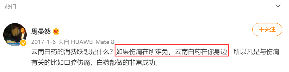 如云南白药凭借「活血、止痛」功能,将产品品类成功拓展,,并通过脍炙人口的广告语“如果伤痛在所难免,云南白药在你身边”,让云南白药走进千家万户。细数云南白药创可贴、牙膏、湿纸巾等产品,基本上都具有「活血、止痛」的产品卖点。