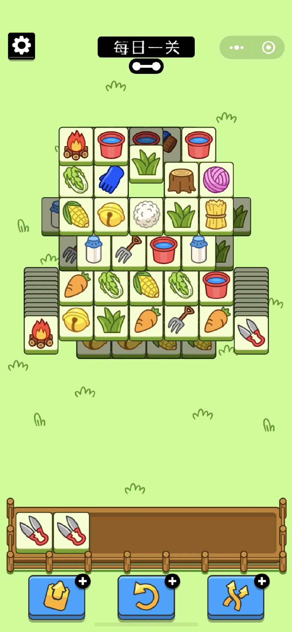 整个游戏一共就两关,玩家通过点选图案放入卡槽对卡牌进行消除,卡槽可放7张牌,3张相同的图案即可完成消除。