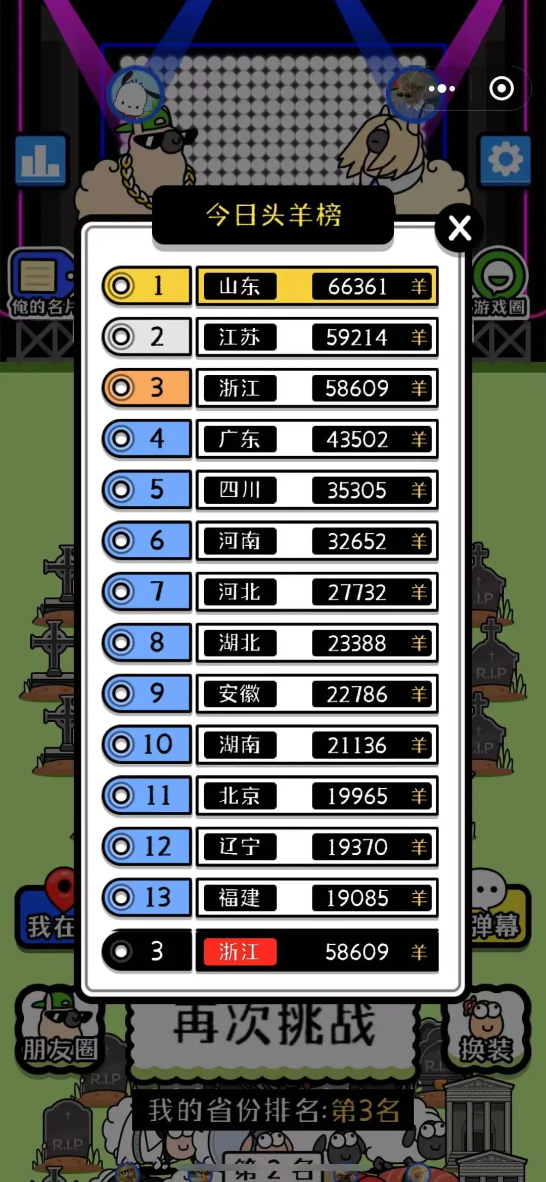 策划者将参与挑战的玩家,按地域划分成了不同战队,以通关人数为标准在小程序首页进行了公示排序: