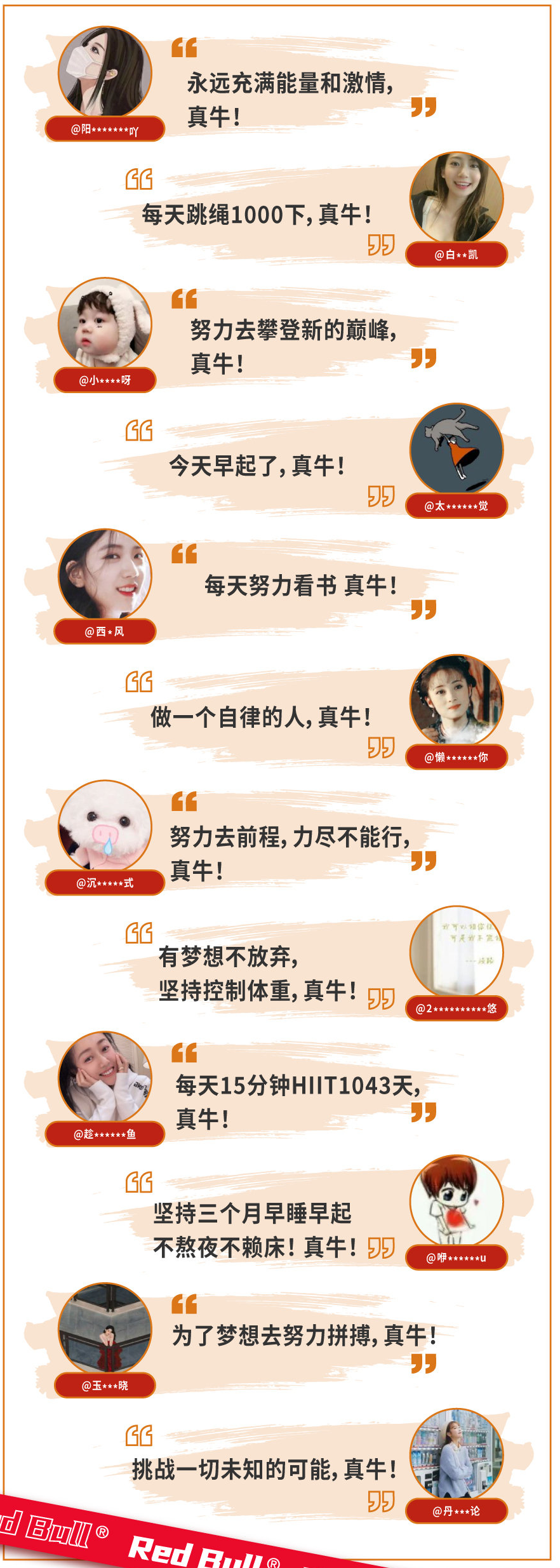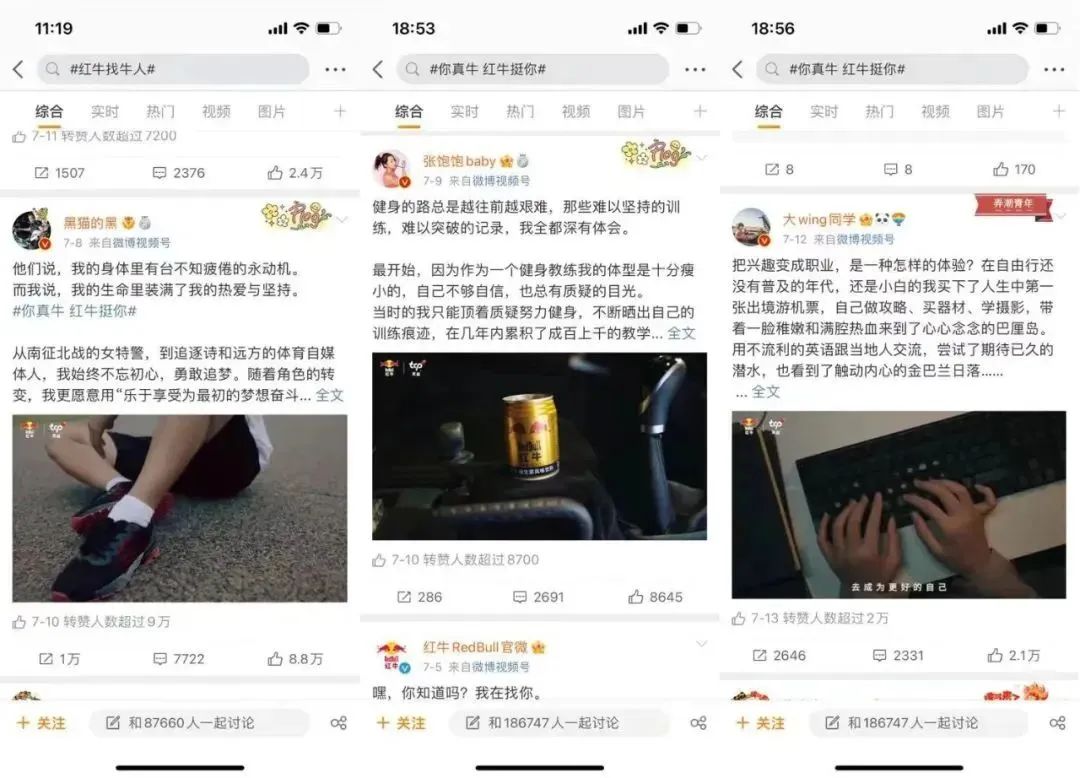 微博作为人人都能参与的舆论场,兼具媒体属性与用户开放共创。在携手新世相收获用户对品牌的认同感,搭建起稳固的情感沟通桥梁的同时,红牛也在品牌官微同步发起了“_____,真牛”句式的故事分享活动,与全网用户展开情感对话,了解他们挑战自我、战胜极限、追求梦想的心路历程。