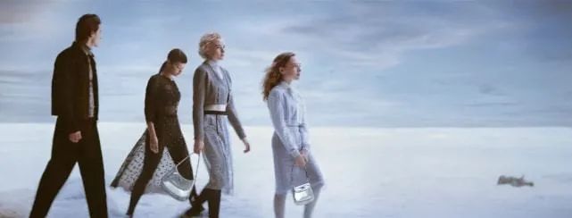 开篇画面就呈现了笼罩于皑皑白雪下的洛杉矶,主角们置身于冰雪世界中,身着节庆服装,前往假日季的欢乐聚会。和其它新品宣传片不同的是Prada没有急着全方位地展示今年的新品,而是选择新品服装上最具亮点的银色元素进行切入,从男主角带钻的鞋到女士银色的包,blingbling的纱裙都把“银装素裹”这个词完美地诠释了。