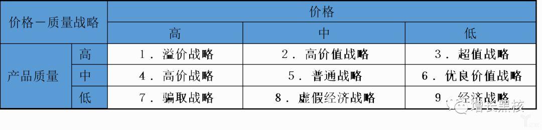 菲利浦.科特勒曾简单描述了基于价格-质量的九种定价策略: