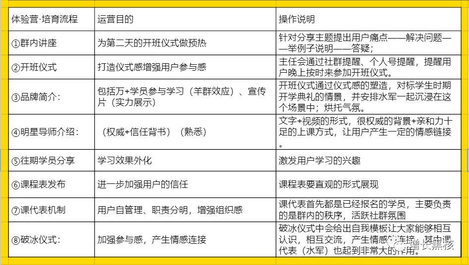 社群开营流程拆解:预热+开班+品牌介绍+导师介绍+成果展示(优秀案例)+课程大纲+规则说明(管理机制)+用户的自我介绍。