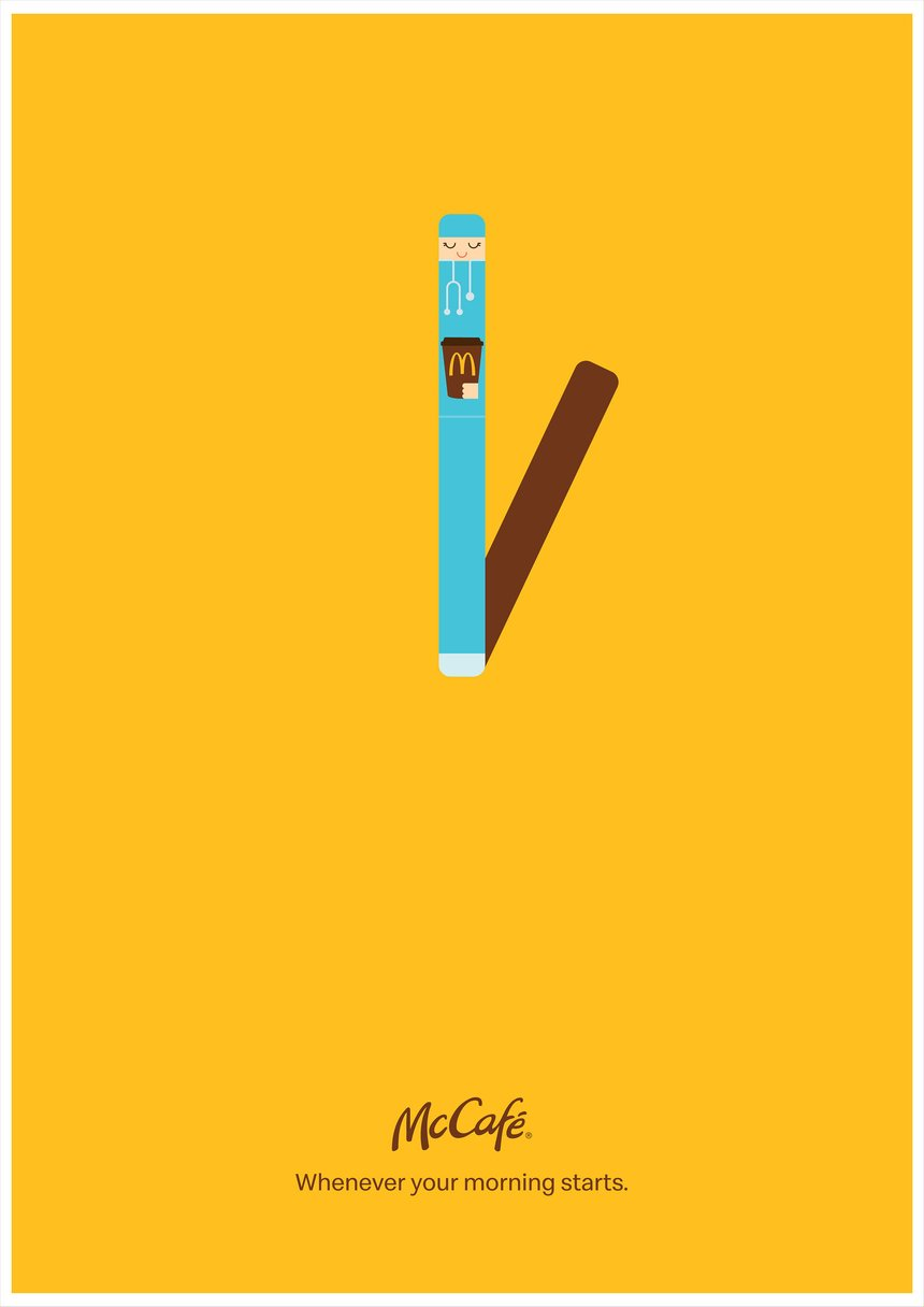 传递类似信息的还有另一组广告,是李奥贝纳为麦咖啡而作。巧妙使用吸管、麦咖啡元素和阴影,模拟出时钟的效果,配合“Whenever your morning starts无论几点开始新的一天”,其背后也指向的是,麦咖啡7X24提供高品质咖啡。