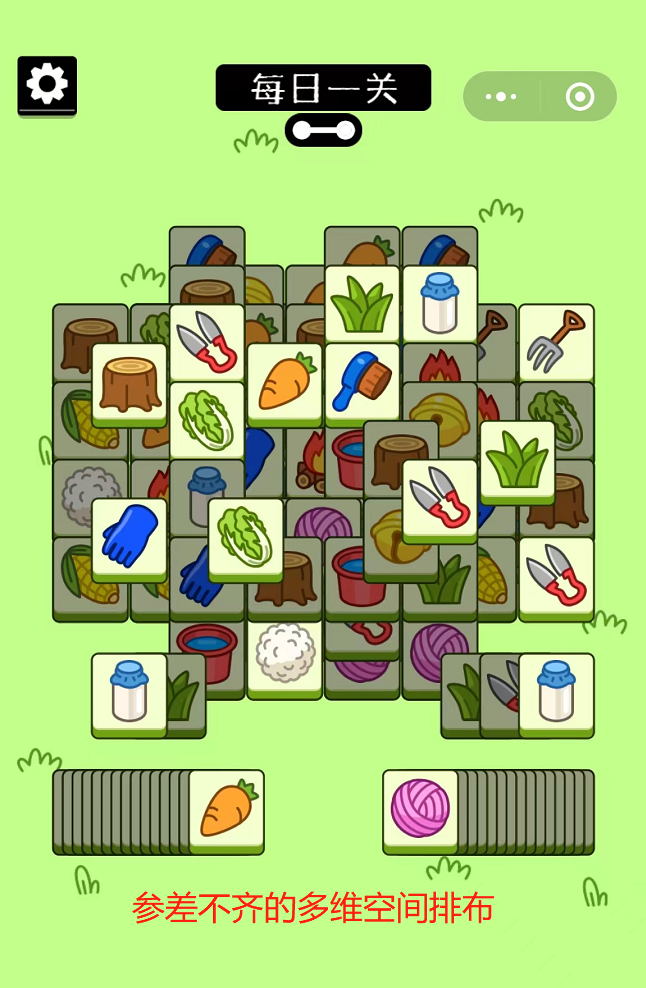 我玩“羊了个羊”游戏时,有无数次栽在明暗不清的多维道具铺排上。举个例子,我以为拿到下面的萝卜道具只需要3步,结果点开后才发现实际层级远比我肉眼看到的层级还要深。用户只要对道具的空间立体铺排理解不到位,就容易落得“一步错,满盘皆落索”的结局。