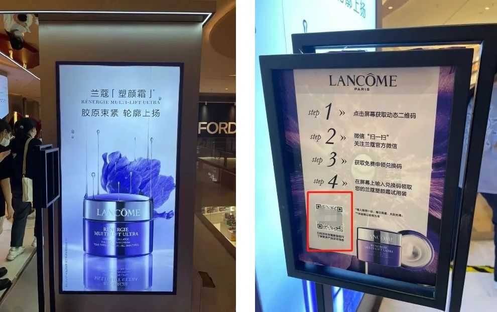 兰蔻在线下放置了小样发放机,添加企微即可获得兑换小样,吸引用户添加企业微信,再引导进入社群。