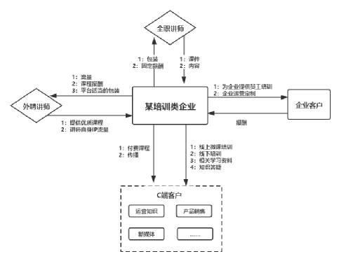 比如某家教育机构,它的主要交易对象可以包括全职讲师、兼职讲师、企业客户和C端客户,然后我们再用连线的方式,去标注出来企业与这些不同的交易对象,他们之间存在着怎样的利益,或服务的互换。