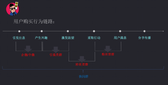 当然,我们也可以把以上所有步骤全部通过一个社群来完成,这个就是所谓的快闪群。就是在一个较短的时间里,去完成用户从产生兴趣到最后付费下单和分享传播的全部过程。所以由此我们也能意识到,快闪群这类社群想要运营好,核心就是要有剧本。因为用户从左边走向右边,在这个过程中肯定是会产生各种问题。在社群矩阵的运营中,我们还可以通过有针对性地去解决,然后一步步地引导用户。而在快闪群里,你是没有这个时间和精力去处理这些的,所以必须要提前设计好剧本,可以说剧本的好坏直接决定了快闪类社群运营的成败。