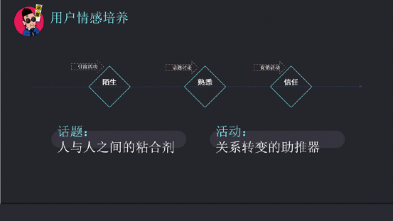 所以营销类活动,它对于用户教育而言,其实是没有太大帮助的,感情的培养最好就是通过话题的创造,通过你们彼此之间的交流、互动,来不断升温。