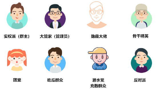 那一个社群内,我们通常可以把角色划分为8个类型,就是上面这8种。当然不同行业、类型的社群,在角色定位上可以有所区别。