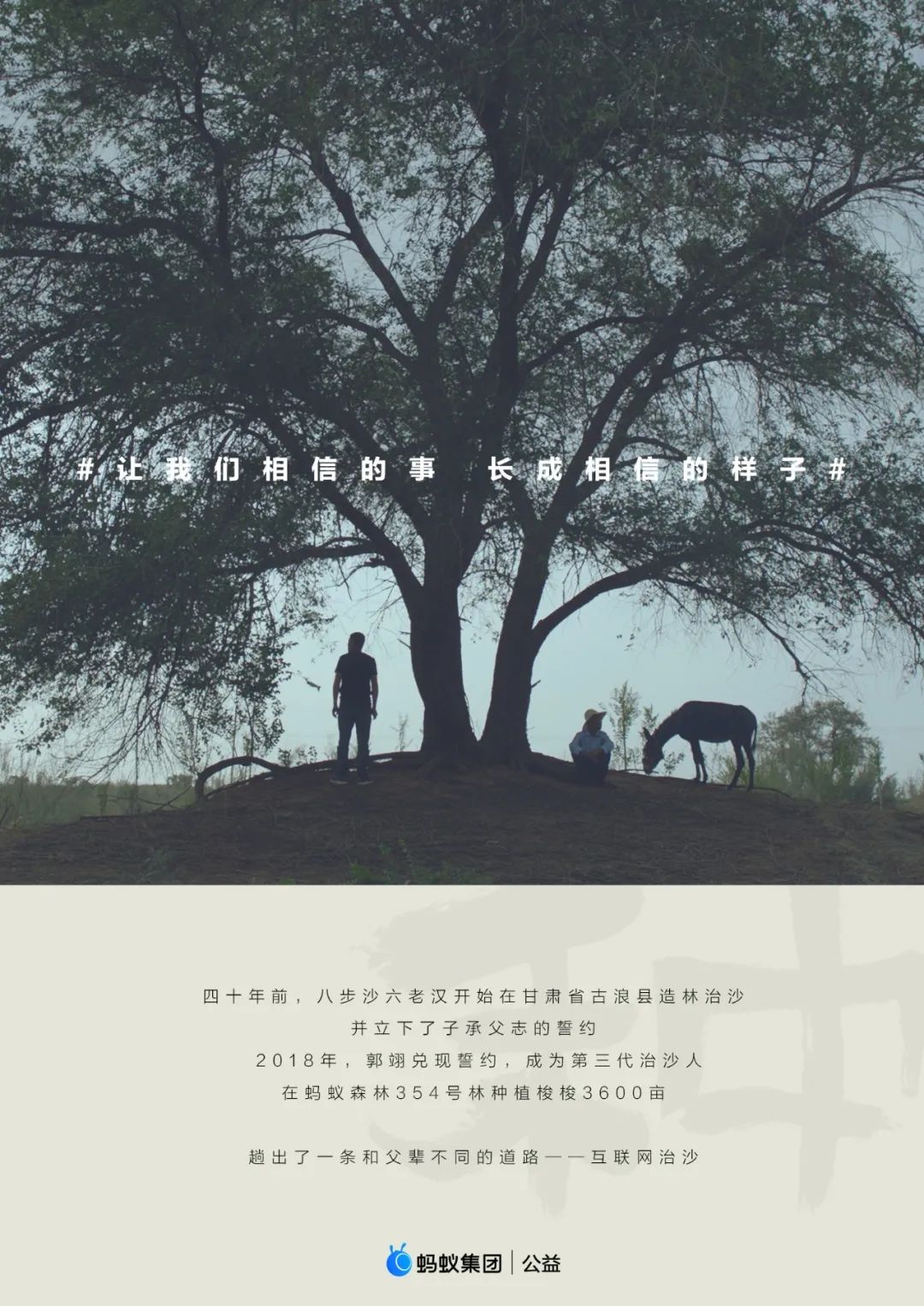 四十年前,八步沙六老汉开始在甘肃省古浪县造林治沙,并立下了子承父志的誓约。2018年,郭翊兑现誓约,成为第三代治沙人。在蚂蚁森林354号林种植梭梭3600亩,趟出了一条和父辈不同的道路——互联网治沙。
