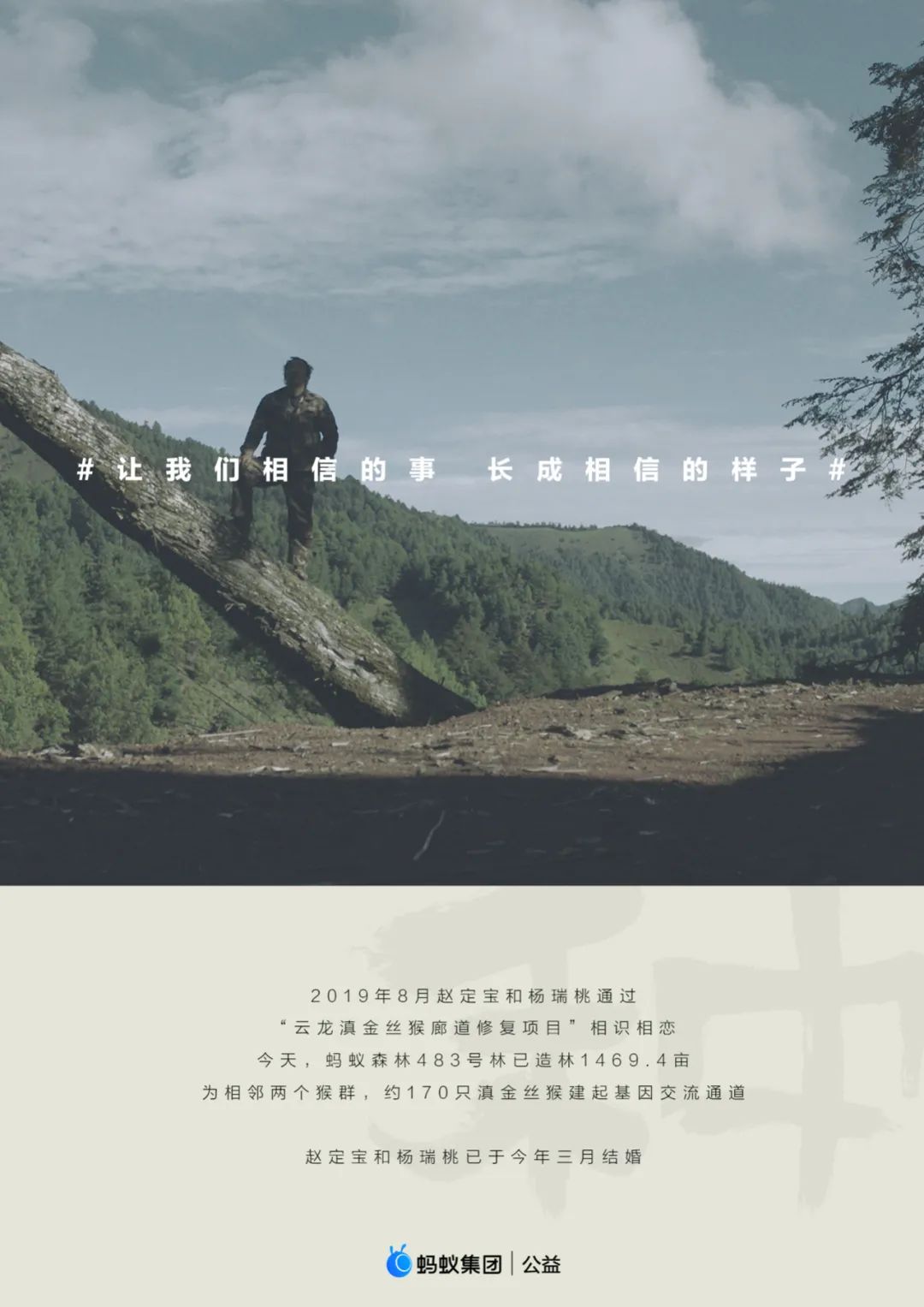 2019年8月,赵定宝和杨瑞桃通过“云龙滇金丝猴廊道修复项目”相识相恋。今天,蚂蚁森林483号林已造林1469.4亩,为相邻两个猴群,约170只滇金丝猴建起基因交流通道。赵定宝和杨瑞桃已于今年三月结婚。