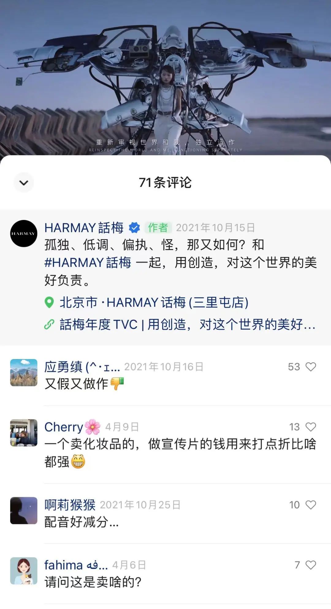 比如美妆集合店品牌HARMAY话梅,在2021年10月就投过这样一条。文案开篇就是:“不介意做一个孤独的人,重新审视世界和我,独立运作……”;后面还堆砌了诸如创造、偏执、解构、重塑、秩序、灵魂等词汇,再配上让人看不懂的前卫影像风格……