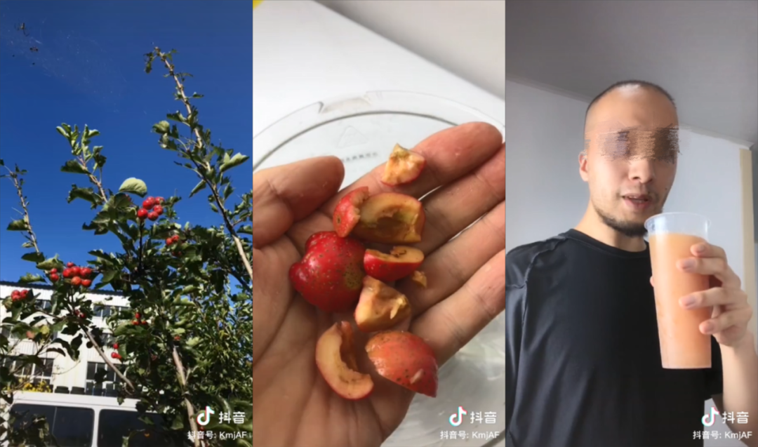 例如这条《整点山楂果回去,教大家做果茶》,确实是跑到了山楂树林里摘果子,画面单调,剧情枯燥,做完后,自己出镜喝了一杯,视频基本就结束了。