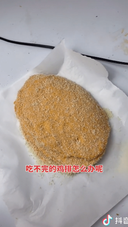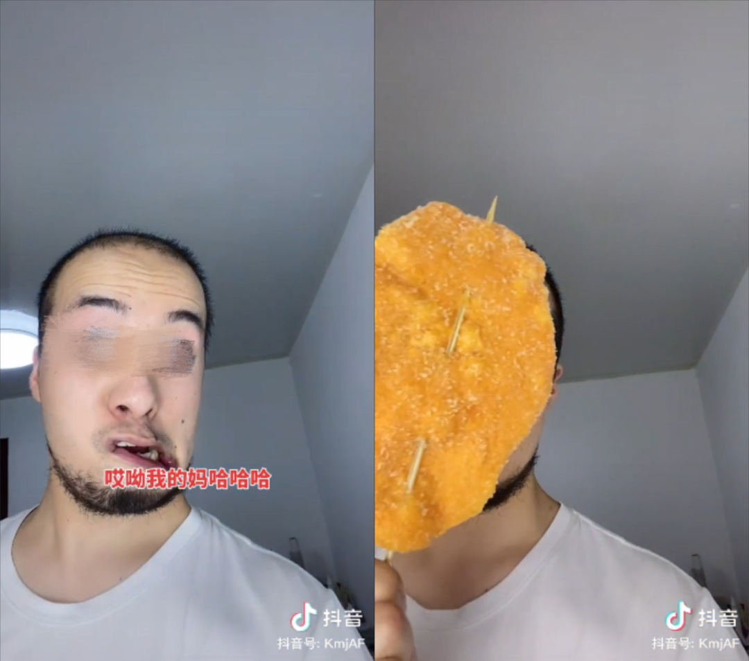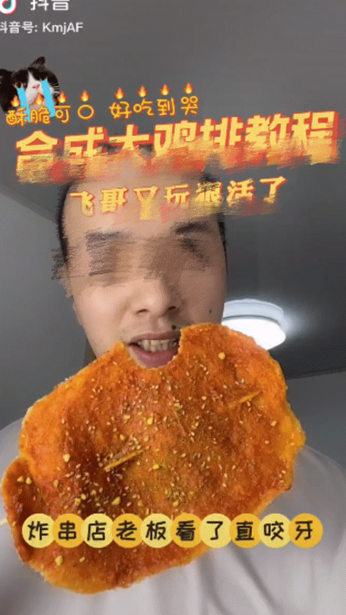 还有一些雷人的骚操作,例如把做好的鸡排,挡在面前晃来晃去,做出狰狞的表情吆喝“这鸡排多大”,继续增加了一定喜剧效果。