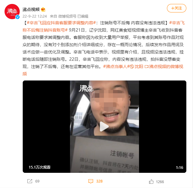 接着过了10多天,抖音客服联系辛吉飞,称有大量用户举报,抖音方面要求其调整视频内容。不过辛吉飞硬怼了回去,说自己的作品没有违法违规,哪里要调整?