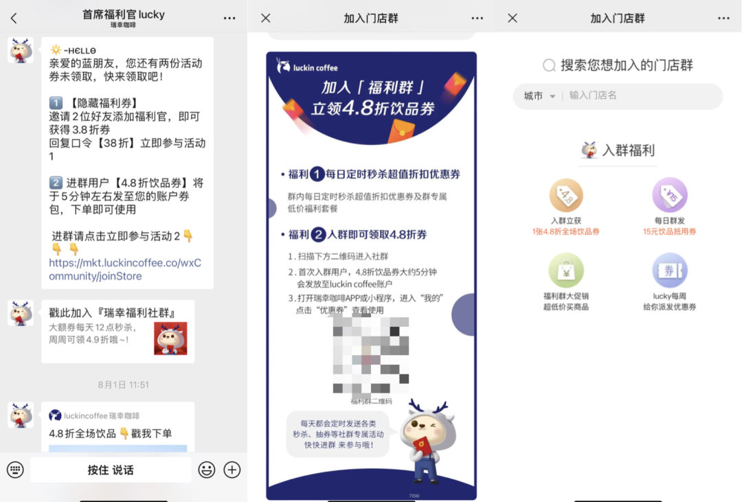 在最基础的操作之上,瑞幸咖啡的玩法又有一定升级之处。瑞幸会先在线下门店设置扫码获得折扣的引导牌,让消费者添加企业微信号“首席福利官lucky”为好友;而后再利用LBS功能,即通过用户定位引导其进入对应的“门店群”。看似只是增加了一个明确用户定位的环节,但这会使得私域内用户相对更清晰,社群的运营也可更具针对性,比如根据不同店铺的销售情况设计优惠券,根据门店库存情况确定折扣商品等等。