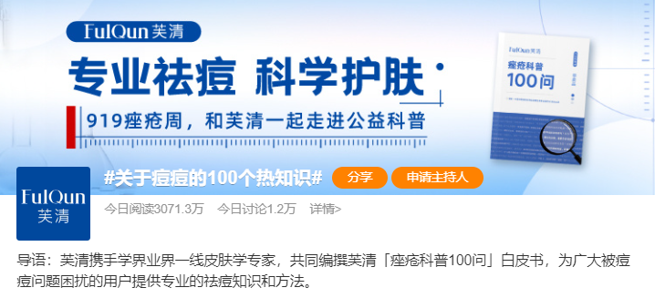 授人以鱼不如授人以渔。为了让用户了解专业、正确的痤疮基础知识,芙清 2021 年携手中国中西医结合学会皮肤性病专业委员会打造「痤疮科普 100 问」白皮书,并按照专业学术版、大众科普版两个方向进行内容筹备。